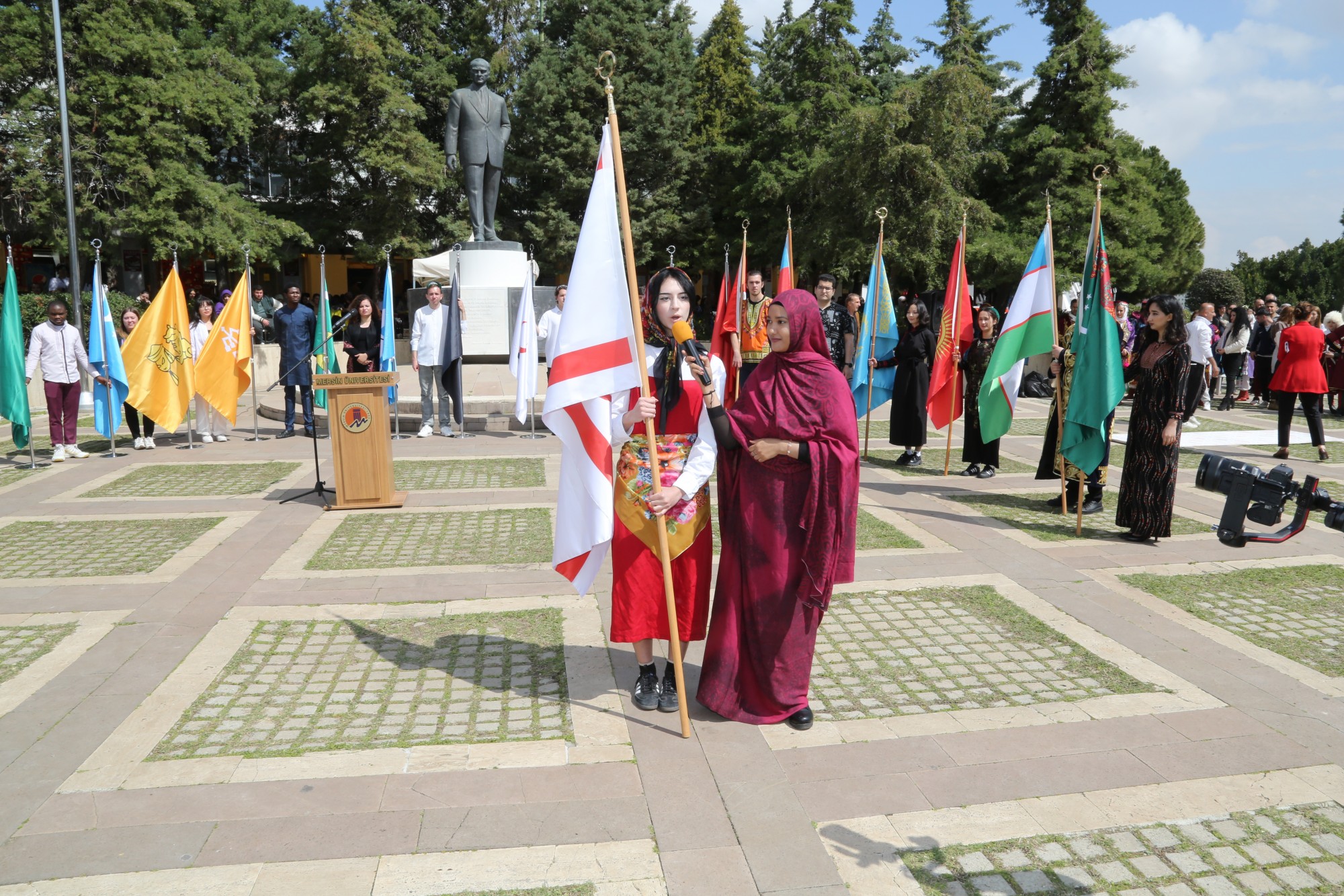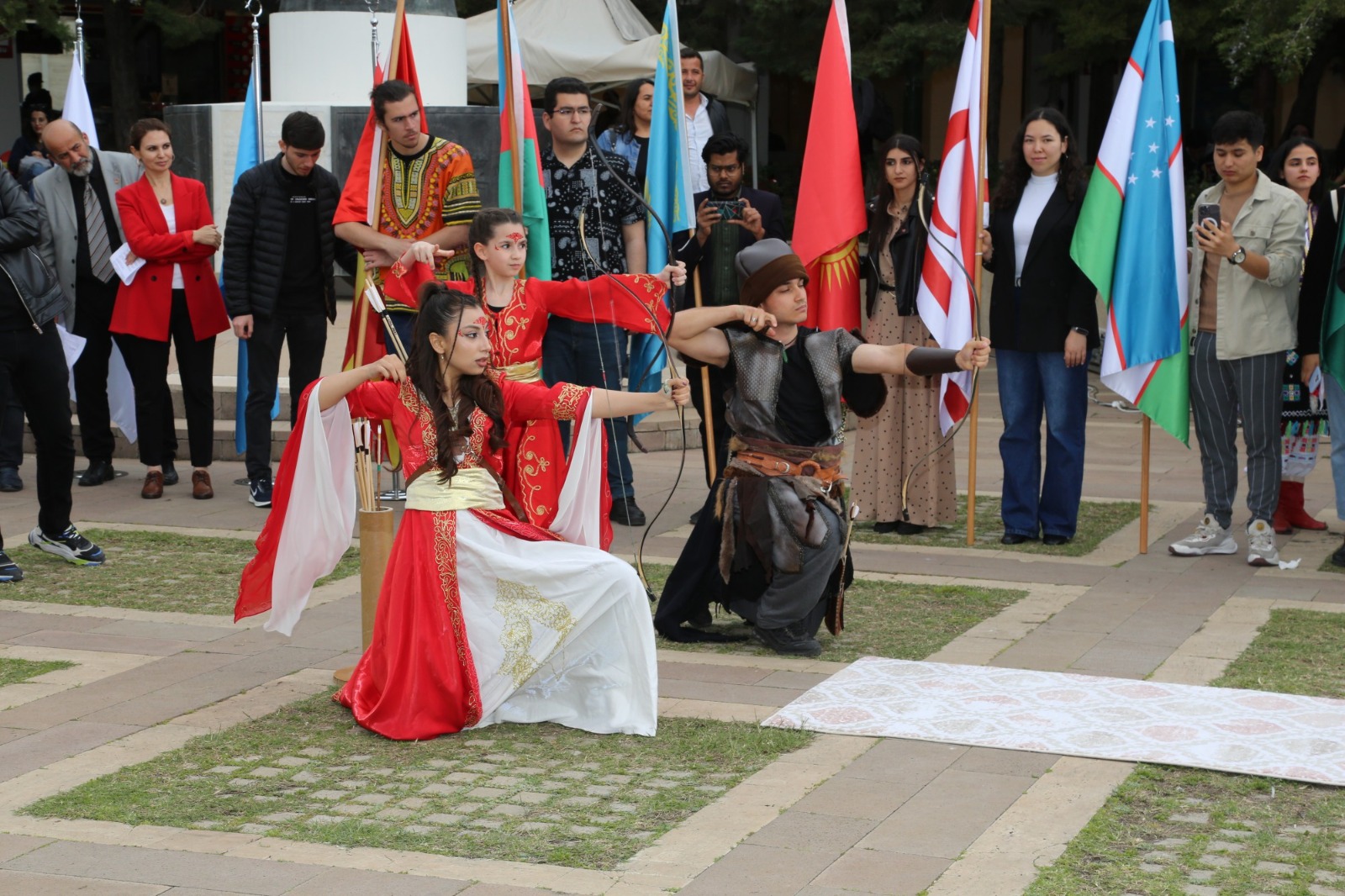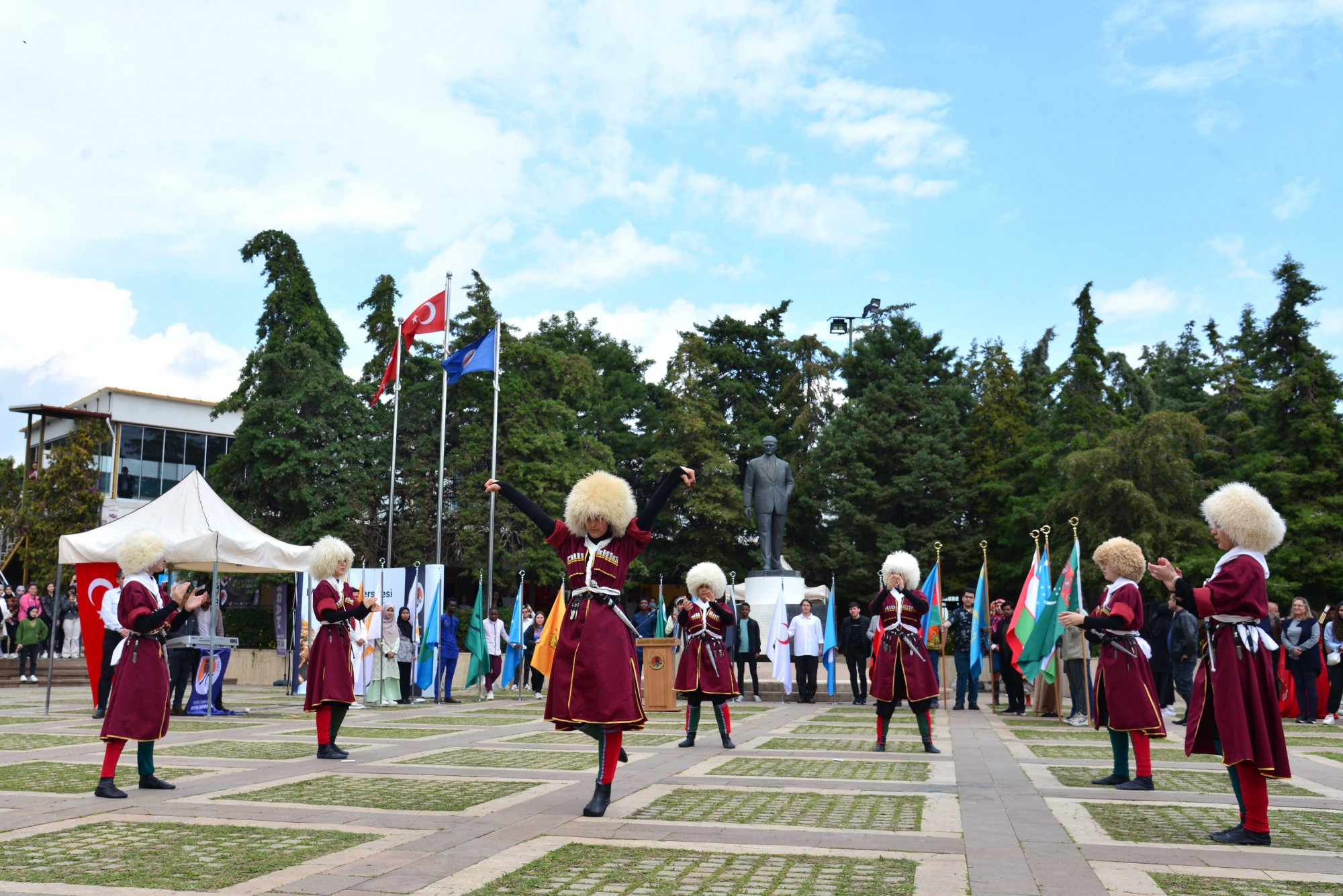 Üniversitemizin Cumhuriyet Meydanı’nda 21 Mart Perşembe günü gerçekleşen programda, TUAM Öğretim Görevlisi Dr. Ümmü Gülsüm Altıner Bozlak’ın koordinatörlüğünde TUAM öğrencileri tarafından 16 Türk devletinin bayraklarından oluşan bayrak geçişi töreni yapıldı. Ardından günümüzde varlığını sürdüren 7 Türk devletini temsil eden öğrencilerin kutlama mesajlarını barındıran maniler okundu. Sonrasında Nevruz kutlamalarının önemini, sevincini, güzelliğini, coşku ve heyecanını katılımcılara aktaran şiirleri, Zuhre Esmaily, Muhammed Navid Nadiri, Azatullah Nazari adlı öğrenciler, TUAM Öğretim Görevlisi Dr. Onur Sömen’in piyano ezgileri eşliğinde okudular.