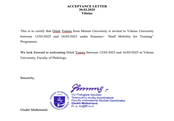Mersin Üniversitesi Türkçe Öğretimi Uygulama ve Araştırma Merkezi (TUAM) Müdürü Doç. Dr. İmran GÜNDÜZ ALPTÜRKER ile Merkez öğretim elemanlarından Öğr. Gör. Dr. Dilek YUMRU, 12-16 Mayıs 2025 tarihleri arasında Litvanya’nın yükseköğretim kurumlarından Vilnius Üniversitesi Filoloji Fakültesinde gerçekleştirilen Erasmus+ Personel Hareketliliği Eğitim Programı’na katıldılar.